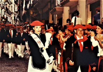 Año 2005. Ruth Hernández Hidalgo. Cantinera de la Compañía Olaberria del Alarde de San Marcial de Irún en la Calle Mayor en el año 2005. fuente archivo