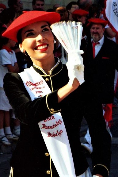 Año 2005. Ruth Hernández Hidalgo. Cantinera de la Compañía Olaberria del Alarde de San Marcial de Irún saludando en el año 2005. fuente archivo