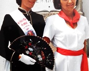 Año 1998. Ainhoa Sarasola Salaberria. Cantinera de la Compañía Olearso del Alarde de Hondarribia con la Compañía en 1998 fiente A. Sarasola