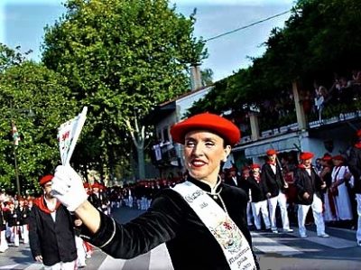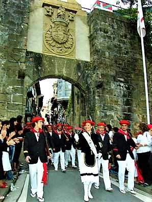 Año 2005. Idoia Izeta Hernández . Cantinera de la Compañía Olearso del Alarde de Hondarribia al paso por la puerta de santa María en 2005 fuente archivo