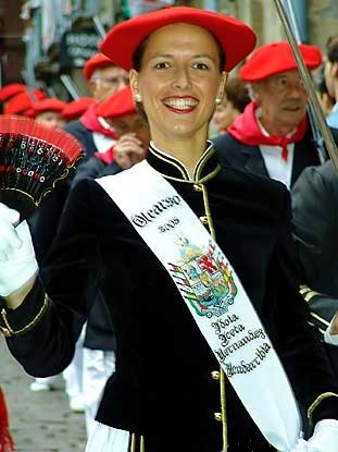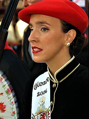 Año 2006.acarena Dilla Oliden. Cantinera de la Compañía Olearso del Alarde de Hondarribia sonriente en el año 2006. fuente archivo