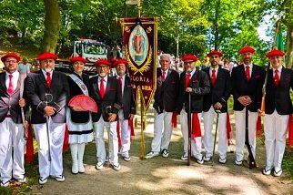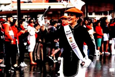 Año 2017. Leire Legorburu Gallego. Cantinera de la Compañía Lapice del Alarde de San Marcial de Irún en la Plaza San Juan en 2017. fuente Leire Legorburu