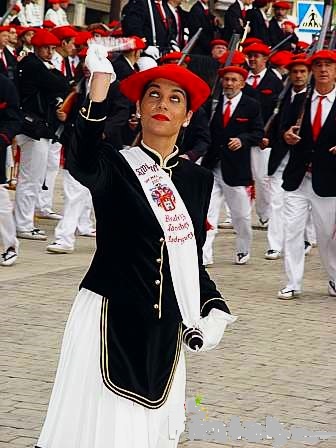 Año 2003. Beatriz Sánchez Rodríguez. Cantinera de la Compañía San Miguel del Alarde de San Marcial de Irún saludando en el año 2003. fuente festak