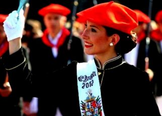 Año 2008. Miren Alcain Arocena. Cantinera de la Compañía Semisarga del Alarde de Hondarribia con su Compañía en el 2008. fuente archivo