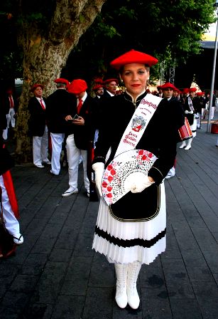 Año 2016. Mª Victoria Oronoz Biurrarena, Cantinera de la Compañía Bidasoa del Alarde de San Marcial de Irún, en la Plaza Urdanibia en el año 2016. foto archivo