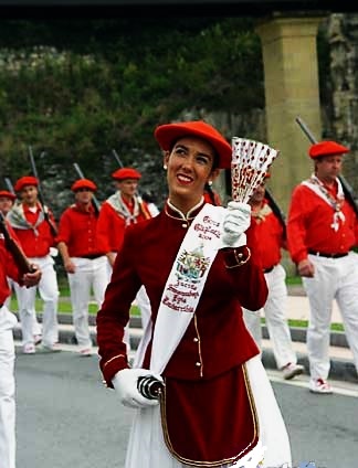 Año 2004. Zuriñe Sunsundegi Egia. Cantinera de la Compañía Gora Gazteak del Alarde de Hondarribia con abanico en el año 2004.